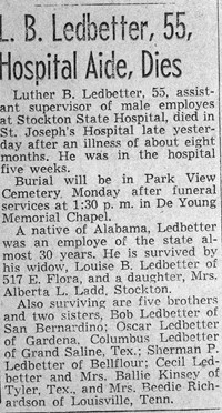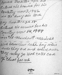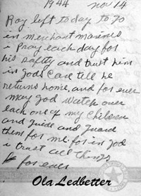 Picture # Picture Discription 1 Arthur Scott (Uncle Arthur) and Roy Patrick Ledbetter (S/O CC & Ola Ledbeter) 2 Beadie Thelma Ledbetter (D/O Henry Baxter & Martha Matilda Ledbetter. Sister/O CC Ledbetter) 3 Beadie Thelma Ledbetter 4 Bob Ledbetter (S/O Henry Baxter & Martha Matilda Ledbetter) 5 Betty Teal Miller (D/O BJ & Ruth Teal) & Roy Phillip Ledbetter (S/O Roy Patrick & LaVerne Davis Ledbetter) 6 Carroll School 1935 (Second Row, First Boy on the left: Cecil Horace Ledbetter S/O CC & Mattie Viola Ledbetter) 7 Left to Right: Columbus Clear (CC or Tab) Ledbetter & brothers: Luther Baxter & Sherman Patrick Ledbetter 8 Columbus Clear Ledbetter (CC or Tab) S/O Henry Baxter & Martha Matilda Peebles Ledbetter 9 CC Ledbetter holding grandson: John Orchard, Jr. 10 CC Ledbetter with wife: Mattie Viola (Ola) Hodge Ledbetter 11 Standing on right: CC Ledbetter 12 Adults L-R: CC Ledbetter & Ola Hodge Ledbetter. Children L-R: Roy Patrick, Oma Adell, Cecil Horace & Edna Ruth) 13 L-R: Edna Ruth (Ruth), Cecil Horace (Horace or Poke), CC (or Tab), Roy Patrick (Roy or Didjum), Mattie Viola (Ola) Ledbetter 14 Mattie Viola (Ola) Hodge Ledbetter & Columbus Clear (CC or Tab) Ledbetter 15 Oma Adell (Oma Dell) and Cecil Horace (Horace or Poke) Ledbetter 16 Cecil Horace (Horace or Poke) Ledbetter 17 David Raymond (Dave); Lynda Joyce, & John (Johnnie) Orchard (children of Oma Adell Ledbetter Orchard Hamilton) 18 Edgar Ledbetter (S/O Luther Ledbetter) with wife Mamie & Daughter 19 L-R: Roy Phillip (Phil) Ledbetter, Edna Ruth (Ruth or Tater) Ledbetter Teal, Joe Kevin Ledbetter & Betty Teal Miller (D/O Ruth) 20 Edna Ruth (Ruth, Tootsie or Tater; b 1925 d 1993) 22 Edna Ruth (Ruth or Tater) Ledbetter Teal and LaVerne Davis Ledbetter (Roy's widow) in 1985 23 Henry Baxter Ledbetter and wife Martha Matilda Peebles Ledbetter my gg grandparents. 24 Cecil Horace (Horace or Poke) Ledbetter eldest son of CC and Mattie Viola Hodge Ledbetter. 25 Jack Kinsey (son of Ballie Ledbetter Kinsey and Henry Kinsey) lived mostly in Smith County, Texas 26 Joe Kevin Ledbetter (Kevin) youngest son of Roy Patrick Ledbetter and LaVerne Davis Ledbetter. 27 John C. Orchard Jr. and David Raymond Orchard (sons of Oma Adell Ledbetter Orchard Hamilton & John C. Orchard, Sr.) 28 John C. Orchard, Jr. and David Raymone Orchard ages 1 and 7 months (sons of Oma Adell Ledbetter Hamilton & John C. Orchard, Sr.) 29 John C. Orchard, III (son of John C. Orchard, Jr.) 30 John C. Orchard, Jr. May 1948 31 John C. Orchard, Sr. 1948 32 Joe Kevin Ledbetter ca 6 months (Youngest son of Roy Patrick Ledbetter and LaVerne Davis Ledbetter) 33 Joe Kevin Ledbetter 34 Joe Kevin Ledbetter 35 Joe Kevin Ledbetter February 1956 36 LaVerne Davis Ledbetter (widow of Roy Patrick Ledbetter) 1985 37 LaVerne Davis Ledbetter 1985 38 LaVerne Davis Ledbetter and grand daughter Brandy (Brandy is the eldest daughter of Roy Phillip Ledbetter & Patricia Hilz Ledbetter) 39 LaVerne Davis Ledbetter 40 LaVerne Davis Ledbetter at Crater Lake 41 Roy Patrick Ledbetter, LaVerne Davis Ledbetter & Billie Joe (B.J.) Teal (husband of Edna Ruth Ledbetter Teal) 42 Lela Ledbetter Benson (daughter of Luther Ledbetter) & daughter Virginia Benson Thomas 43 Luther Baxter Ledbetter's Obituary 44 Luther Baxter Ledbetter & wife Martha Matilda Peebles Ledbetter & 10 of their 12 children. 45 LaVerne Davis Ledbetter & Edna Ruth Ledbetter Teal 1985 46 LaVerne Davis Ledbetter 47 LaVerne Davis Ledbetter & Billie Joe (B.J.) Teal 1985 48 LaVerne Davis Ledbetter after a fishing trip 49 LaVerne Davis Ledbetter & Edna Ruth Ledbetter Teal 1985 50 Note written by Mattie Viola (Ola) Hodge Ledbetter 51 Martha Matilda Peebles Ledbetter and 6 of her 12 children. It is unknown where this picture was taken, probably Alabama 52 Back Row: B.J. Teal, Don Allen (Donnie) Ledbetter, Edna Ruth Ledbetter Teal Mattie Viola Hodge Ledbetter & Jerline Reynolds LBedbetter; Front Row: Betty Louise Teal Miller, Cecil Horace and Gary Lee Ledbetter. 53 Joe Kevin Ledbetter, LaVerne Davis Ledbetter & Roy Phillip Ledbetter 1993 54 Back: Cecil Horace & Roy Patrick Ledbetter & Mattie Viola Hodge Ledbetter; Front: Edna Ruth Ledbetter Teal & Oma Adell Ledbetter Orchard Hamilton. 55 Cecil Horace, Roy Phillip, Edna Ruth & Oma Adell Ledbetter 56 Oma Adell, Cecil Horace, Edna Ruth and Roy Patrick Ledbetter 57 Cecil Horace Ledbetter and sons of Ballie & Henry Kinsey. 58 Lynda Joyce Orchard Rutherford (daughter of John C. Orchard, SR & Oma Adell Ledbetter Orchard) 59 Maurice Maynard & wife Mildred Kinsey Maynard 60 Tricia & Mikey Murphy 61 Mildred Kinsey Maynard 62 Mildred Kinsey Maynard 63 Neva Dick & Teddy Ledbetter (Neva was daughter of Neva & Pat Ledbetter) 64 Martha Matilda Peebles Ledbetter & six of her 12 children. C.C. Ledbetter is the little boy to the far left. 65 Neva Dick Murphy (daughter of Neva & Pat Ledbetter) 66 Nancy Ledbetter (Aunt Nan) wife of Asbury Ledbetter, half brother to Richard Baxter Ledbetter) 67 Neva Dick Murphy (daughter of Neva & Pat Ledbetter) 68 L-R Oma Adell & Cecil Horace Ledbetter with friends at Red Hill Rec. Center 69 Oma Adell Ledbetter Orchard Hamilton (1939-1940 School year) 70 Oma Adell Ledbetter Orchard Hamilton (1940-1941 School year) 71 Oma Adell Ledbetter Orchard Hamilton 72 Oma Adell Ledbetter Orchard Hamilton 73 Oma Adell Ledbetter Orchard Hamilton 74 Oma Adell Ledbetter Orchard Hamilton 75 John C. Orchard Jr. & wife Oma Adell Ledbetter Orchard Hamilton; John Jr., David Raymond & Lynda Joyce Orchard) 76 L-R: Timothy James, John C., Jr., Lynda Joyce, John C., Jr. & David Raymond Orchard 79 L-R: Mattie Viola Hodge Ledbetter, Betty Teal Miller, Roy Phillip Ledbetter & C.C. Ledbetter 80 Marriage License 81 Roy Phillip Ledbetter & Betty Teal Miller on Jugg & Peanut 82 Roy Phillip Ledbetter in Marines 83 Roy Phillip Ledbetter 84 Roy Phillip Ledbetter 85 Roy Phillip Ledbetter 86 Roy Phillip Ledbetter running up FM 17 from the little house they lived in below where Tab and Ola Ledbetter lived on their property. He was